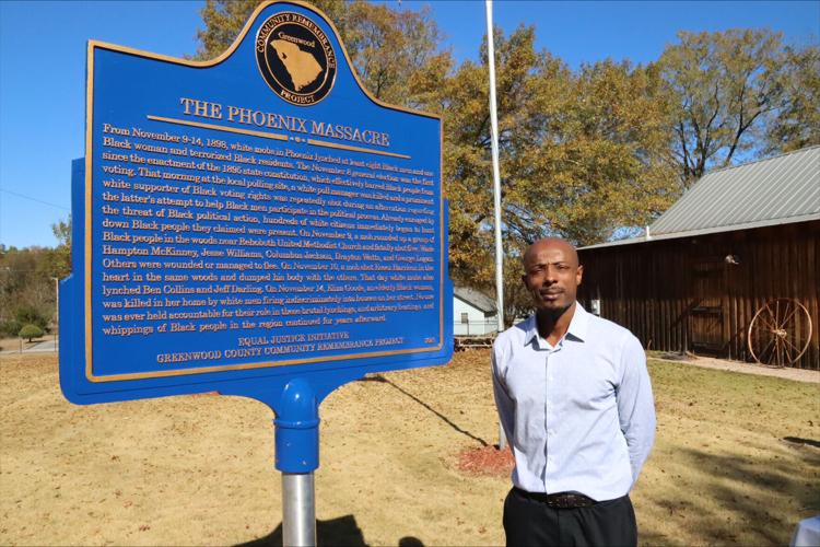 Donald McKinney, great-nephew of Phoenix Massacre victim Wade Hampton McKinney, stands beside the EJI Community Remembrance Project marker installed in 2023 at the Dr. Benjamin Mays Historic Preservation Site in Greenwood, South Carolina.